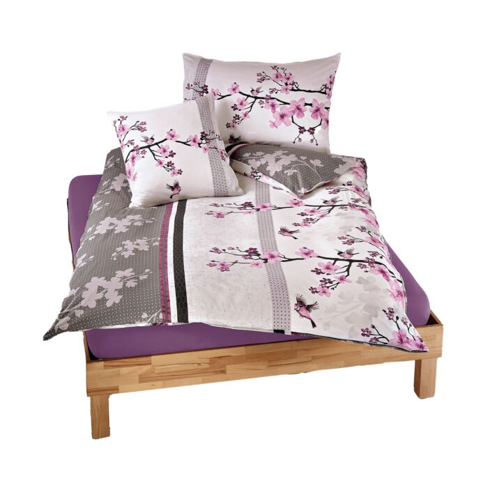 Linge de lit orné de fleurs de cerisier, en violet-anthracite